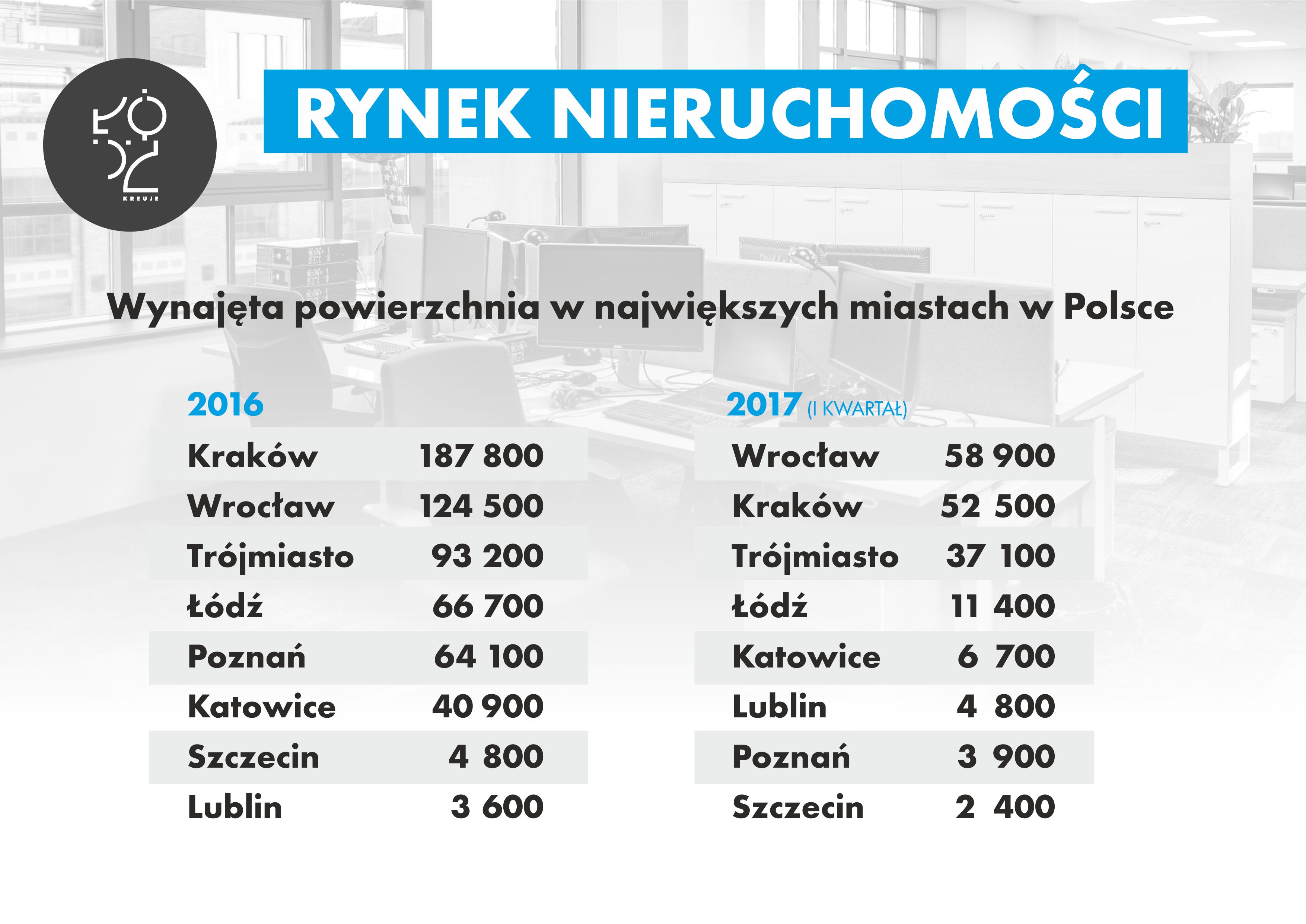 Inwestorzy nie mają problemu ze znajdywaniem najemców do swoich projektów, co potwierdzają nowe dane z rynku. Po podsumowaniu pierwszego kwartału br. wiadomo, że Łodzi udało się prześcignąć na rynku biurowym Poznań i Katowice razem wzięte. Inwestorzy wynajęli w pierwszych trzech miesiącach 2017 roku 11,5 tysiąca mkw. nowoczesnych powierzchni biurowych. To utrzymanie dobrego trendu z zeszłego roku, w którym Łódź z popytem na poziomie 66,7 tys. mkw. była czwartym rynkiem regionalnym w kraju.