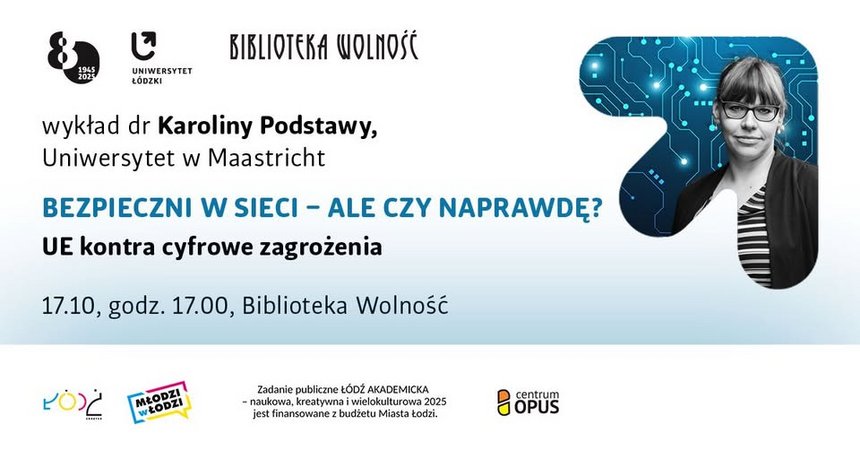 Uniwersytet Łódzki zaprasza na wykład otwarty Karoliny Podstawy, ekspertki w dziedzinie prawa cyfrowego, ochrony danych osobowych i cyberbezpieczeństwa.