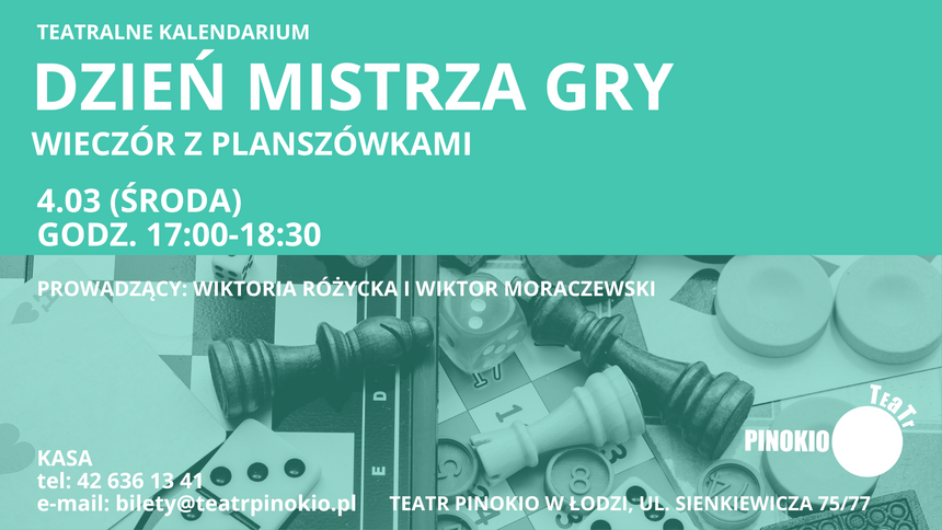 Z okazji Dnia Mistrza Gry zapraszamy do Teatru Pinokio w Łodzi – miejsca, gdzie teatralna wyobraźnia spotka się z planszówkami. Tego wieczoru Pinoteka zamieni się w przestrzeń pełną stołów, przy których czekają różne gry, różne światy i różne historie… a każda z nich może potoczyć się zupełnie inaczej.