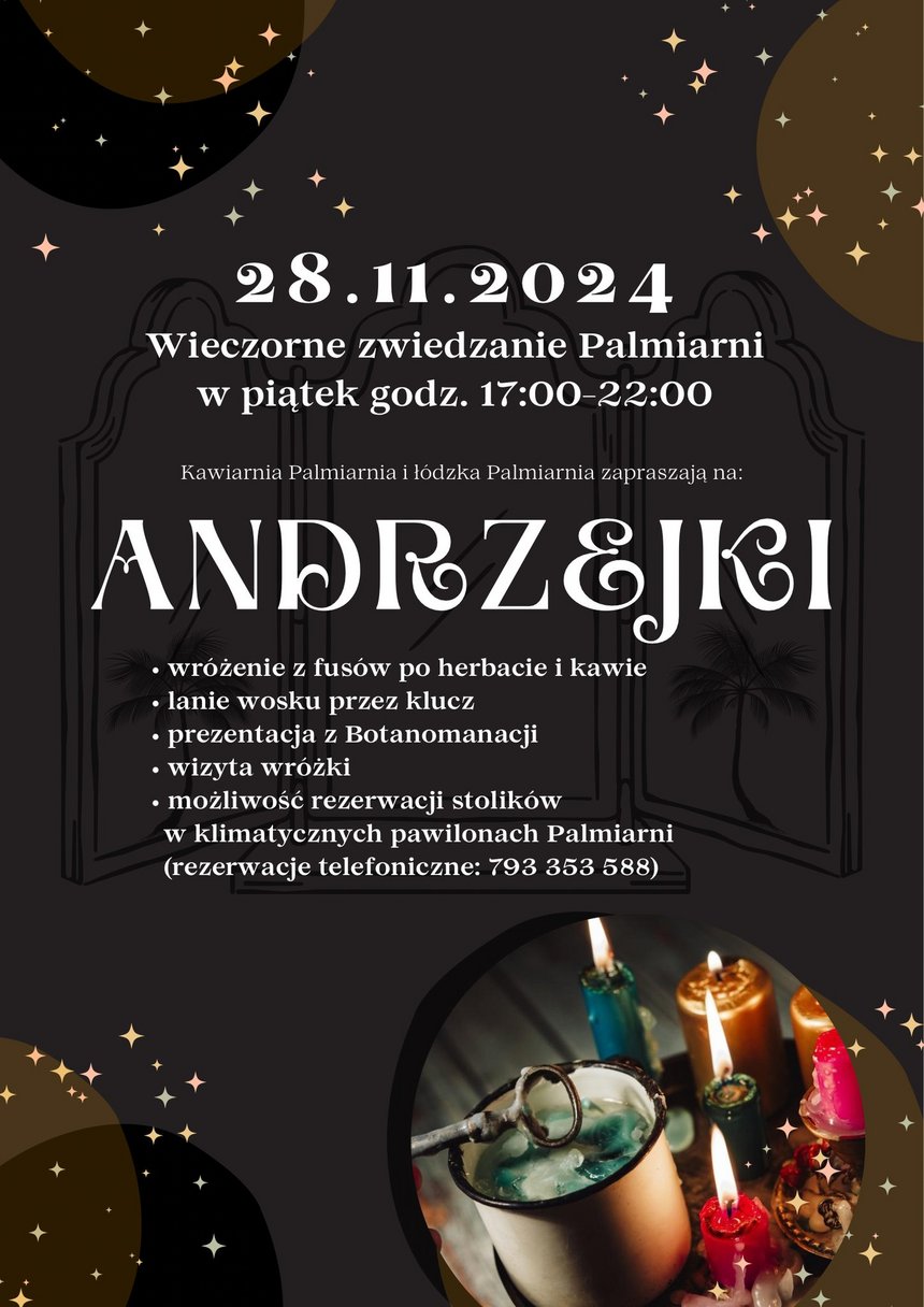 28.11.2025 (piątek) zapraszamy Was na kolejne Nocne zwiedzanie i Andrzejkowy wieczór w Palmiarni i Kawiarnia Palmiarnia.