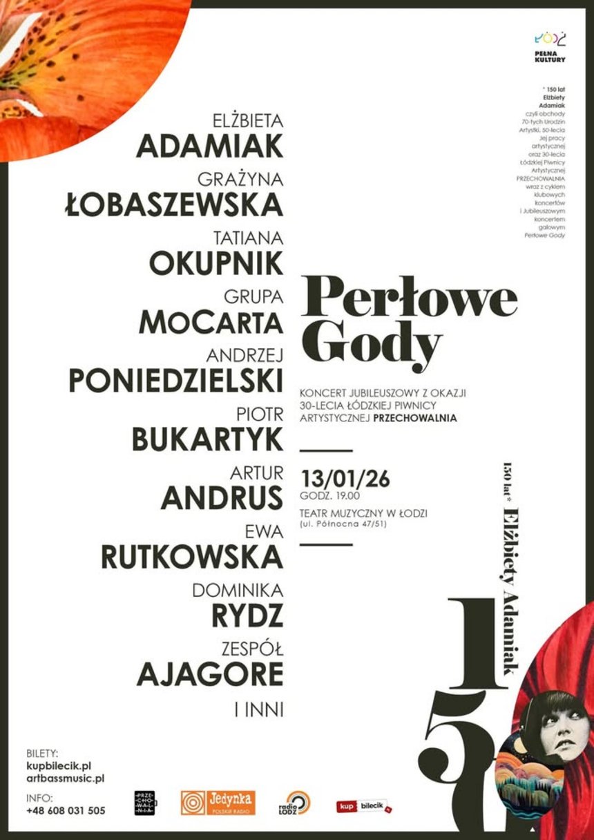 *Zadanie "150 Lat Elżbiety Adamiak" czyli obchody: 70-tych Urodzin Artystki, 50-lecia Jej pracy artystycznej oraz 30-lecia Łódzkiej Piwnicy Artystycznej Przechowalnia wraz z cyklem klubowych koncertów i Jubileuszowym koncertem galowym "Perłowe Gody" jest realizowany dzięki dofinansowaniu z budżetu Miasta Łodzi.
