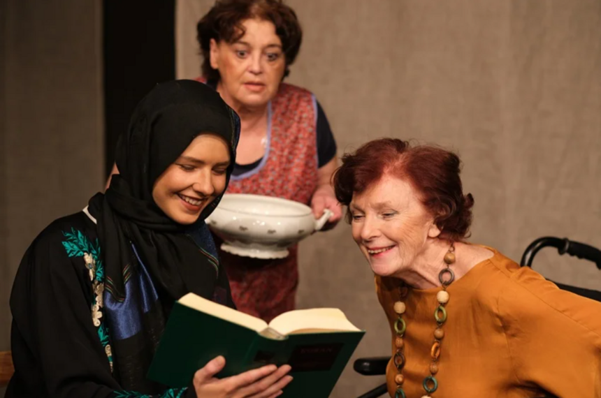 Starsza, nieufna wobec obcych i młoda, otwarta na nowe doświadczenia, powoli przełamują dzielące je bariery, które tak naprawdę są jedynie wytworem wyobraźni, wynikiem takiego a nie innego wychowania, skutkiem indoktrynacji, czy medialnego przekazu. Jest jeszcze ta trzecia, sąsiadka, która reprezentuje postawę zbliżoną do pierwszej bohaterki. Jej poglądy, wymawiane jednak głośno, wzbudzają wątpliwości i zmuszają starszą kobietę do refleksji. Temat, który autor porusza w swoim dramacie, jest jednym z najistotniejszych problemów dzisiejszego świata. Jerzy Szczudlik obłaskawia jednak jego powagę żartem i ironią. Ta pełna humoru historia pokazuje, że często polską katoliczkę więcej łączy z uchodźczynią z dalekiego kraju, niż z sąsiadką zza miedzy.