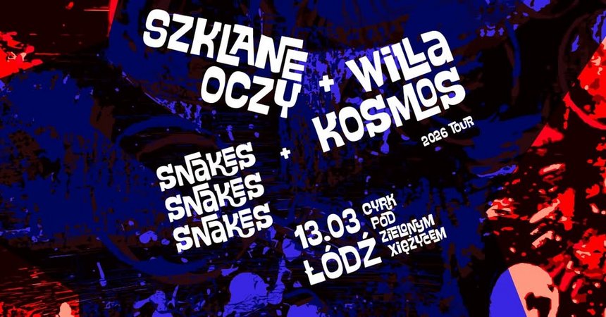 Szklane Oczy i Willa Kosmos ruszają w trasę koncertową! Przy wsparciu Pasem po czole i KW Bookings zespoły zagrają w 4 miastach. 13 marca 2026 roku odwiedzą Cyrk Pod Zielonym Xiężycem w Łodzi, a towarzyszyć będzie im wspaniałe Snakes Snakes Snakes! Bilety dostępne na bramce.